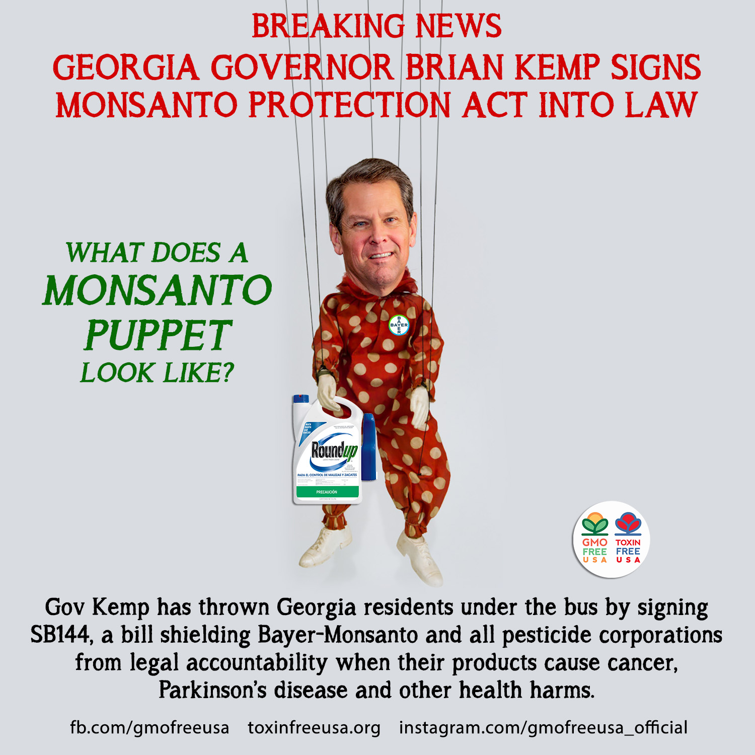 Gov Kemp has thrown Georgia residents under the bus by signing SB144, a bill shielding Bayer-Monsanto and all pesticide corporations from legal accountability when their products cause cancer, Parkinson’s disease and other health harms. As politicians always do when they're passing tremendously unpopular laws, Kemp signed the bill under the cover of darkness... on the Friday right before a busy Mother's Day weekend when no one was paying attention. Georgia becomes the second state to pass a Monsanto Protection Act after North Dakota's Gov Kelly Armstrong signed the same bill for his state at the end of April. This also comes on the heels of a $2.1 billion Georgia jury verdict against Bayer in a Roundup weedkiller/cancer trial that ended in April. We need to get the chemical industry's corrupt politicians out of all levels of government or America will keep getting sicker and sicker.